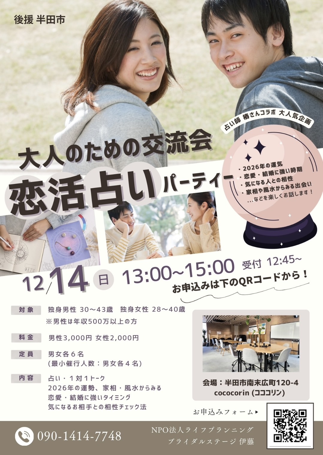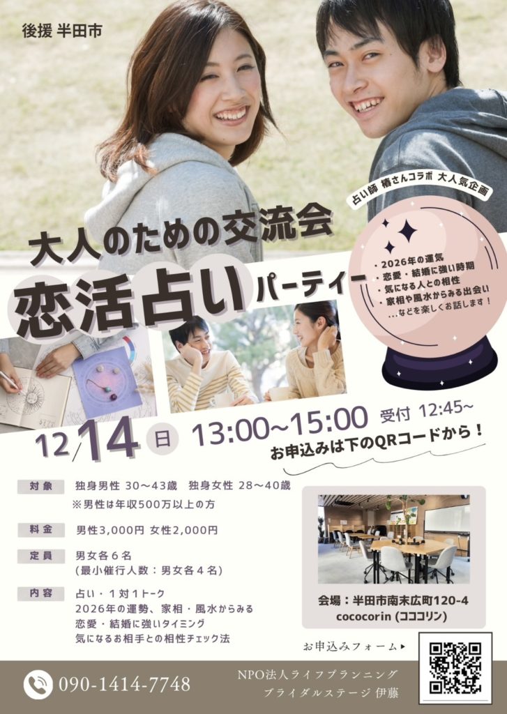 • 備 考:参加当日にご本人確認のため、運転免許証などの提示をしていただきます。占いに生年月日が必要のため、お申し込みの際お願いします。